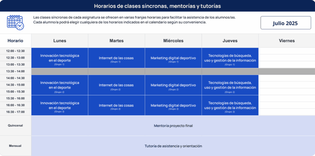 La cuarta edición del curso «Competencias de digitalización, innovación y tecnología en el ecosistema del Deporte» se desarrollará entre el 8 de mayo de 2025 y el 28 de julio de 2025.